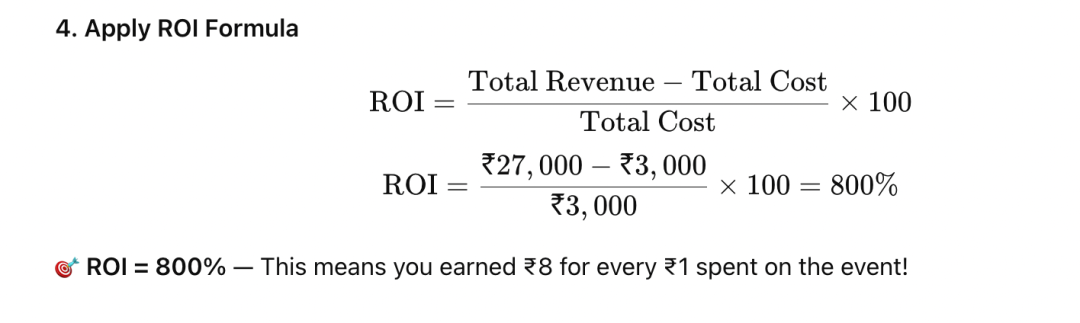 Example: ROI = 800% -> you earned ₹8 for every ₹1 spent on the event.